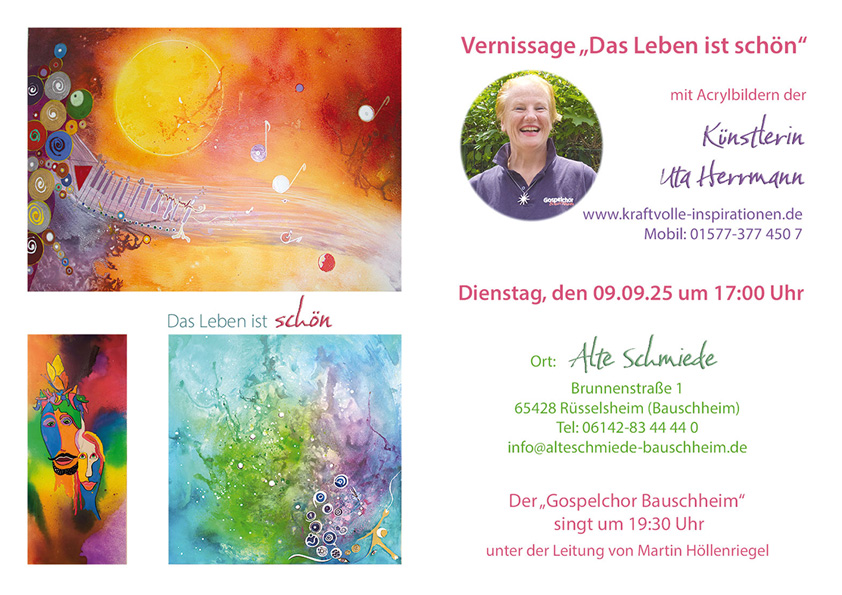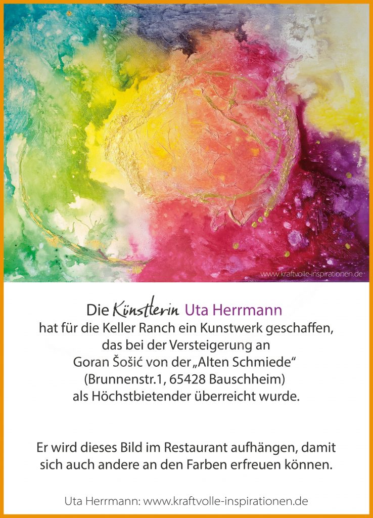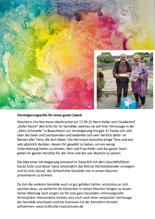 Auch nach meiner Vernissage in Bauschheim/Rüsselsheim sind in der “Alten Schmiede” viele Gemälde bis Dezember 25′ zu sehen (und zu fühlen). Das ersteigerte Gemälde “Wundervolle Welt” wird dort auch präsentiert- es wurde von dem Besitzer selbst ersteigert, weil es einen ganz besonderen Flair in seinen Räumen verbreitet.